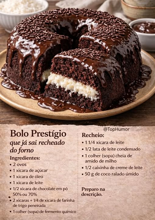 Existem combinações que parecem ter sido criadas pelo destino, e a união entre o chocolate e o coco é, sem dúvida, uma das mais celebradas na confeitaria mundial. No Brasil, essa dupla ganhou um nome icônico: Prestígio. Mas o que acontece quando transformamos esse sabor clássico de bombom em um bolo caseiro, fofinho e com um recheio que já sai pronto do forno? O resultado é o Bolo Bombom de Prestígio, uma sobremesa que desafia a lógica por sua simplicidade técnica e seu impacto visual e gustativo.