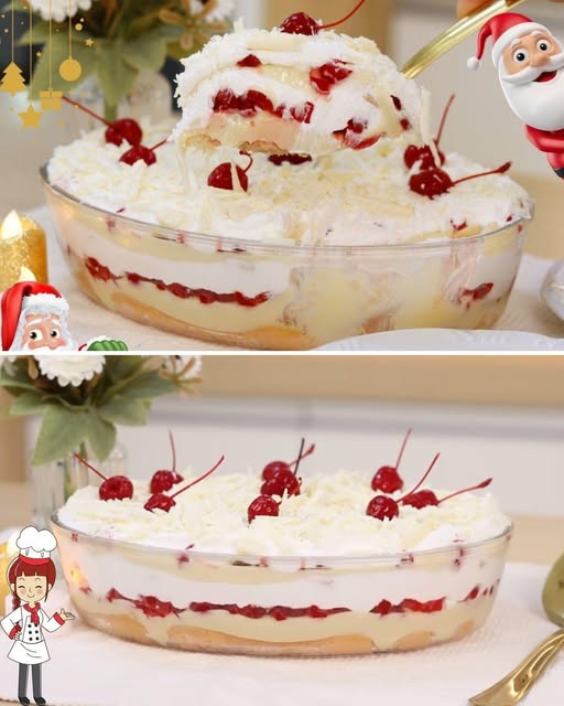 Este doce é um deleite de texturas: a leveza do biscoito champagne umedecido, a densidade do creme de leite condensado e a aeração do chantilly batido, tudo pontuado pela explosão agridoce da cereja. O toque final do chocolate branco ralado cria uma “neve” que evoca o luxo e o clima festivo.
