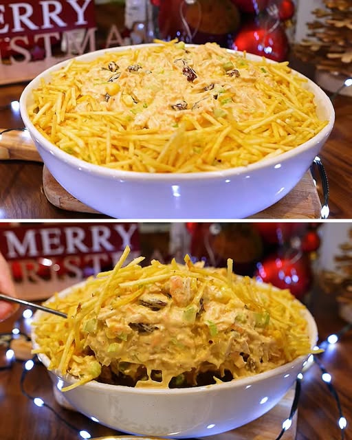 2. Servir: Sirva o Salpicão de Frango com batata palha (opcional, mas altamente recomendado para crocância) e em uma travessa elegante.